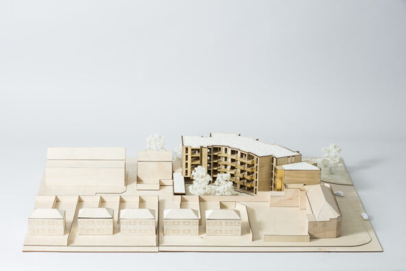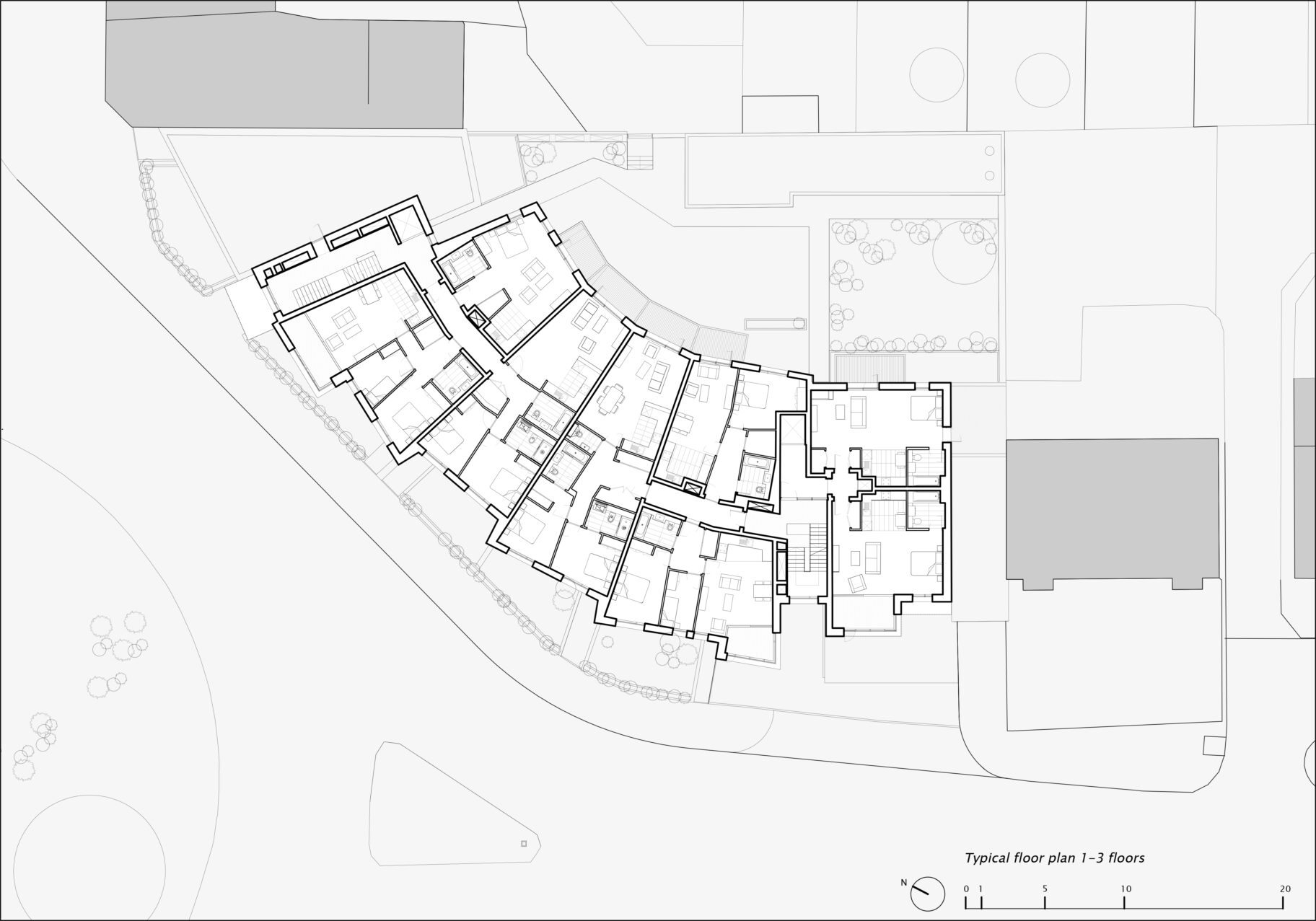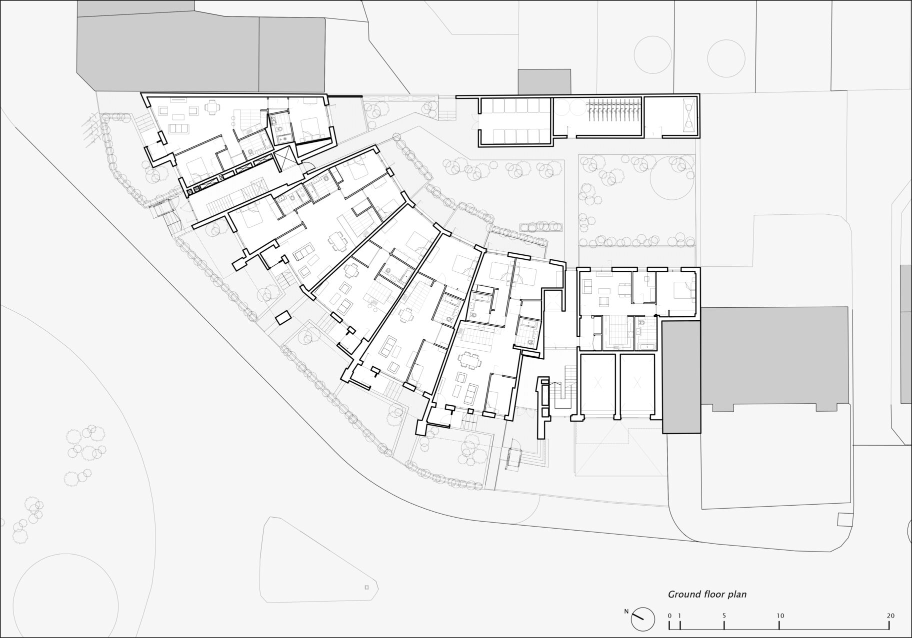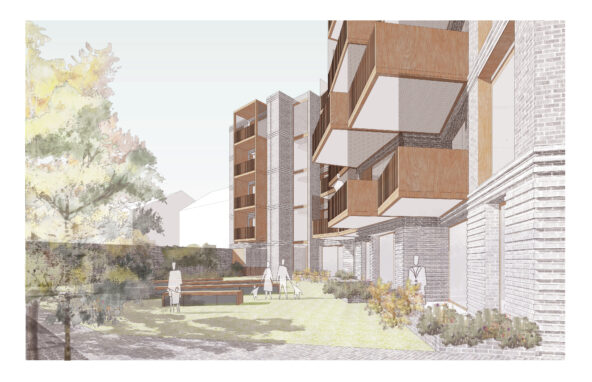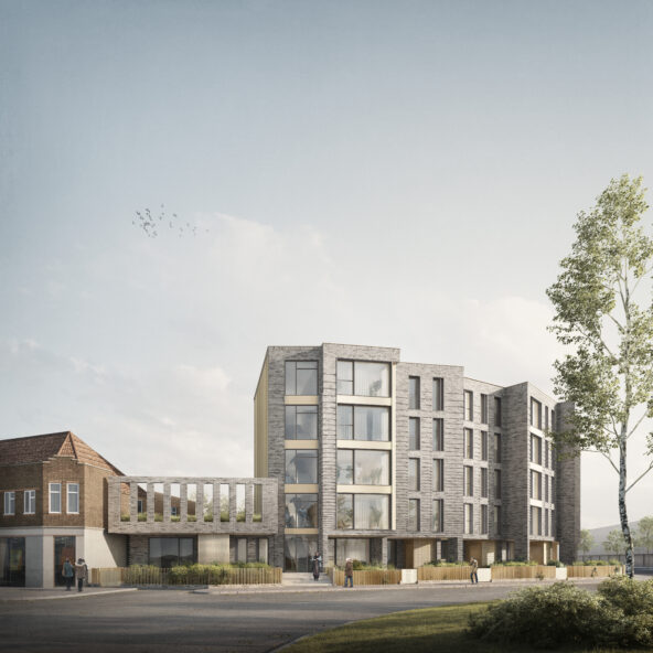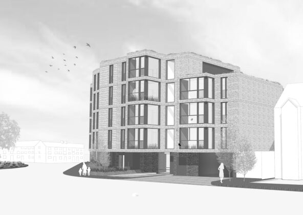 The stepping in plan is a key driver for the design, each apartment id formed from a segment which is set out from a point to the West of the site. Each segment is then rotated along the site, much like an opening fan. As the segments turn across the site, they also move in and out, stepping both to the front and back. This step allows the ground floor apartments to have a larger garden and buffer space between the rooms and the pavement. In turn the rear stepping in and out breaks up the mass and rear elevation and gives the opportunity to have a mix of balcony types which undulate around the building.