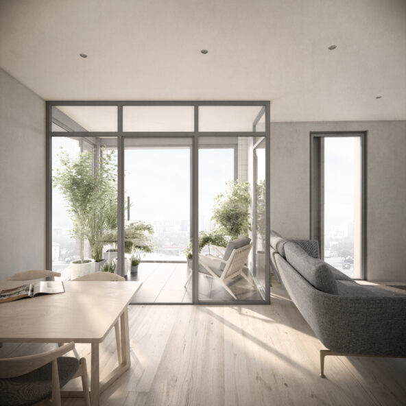 temperature between the interior of the apartment and the outside. Furthermore, the winter gardens offer an out door space that can be closed off that could also be used much like a balcony or reading study space in the double aspect flats.