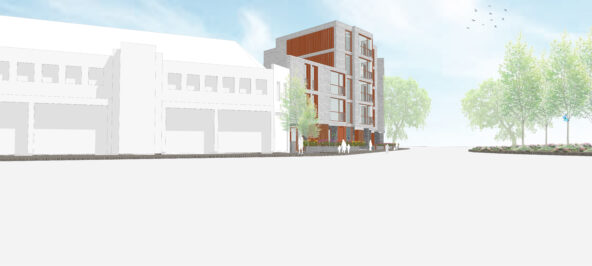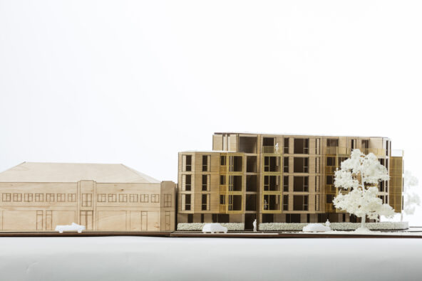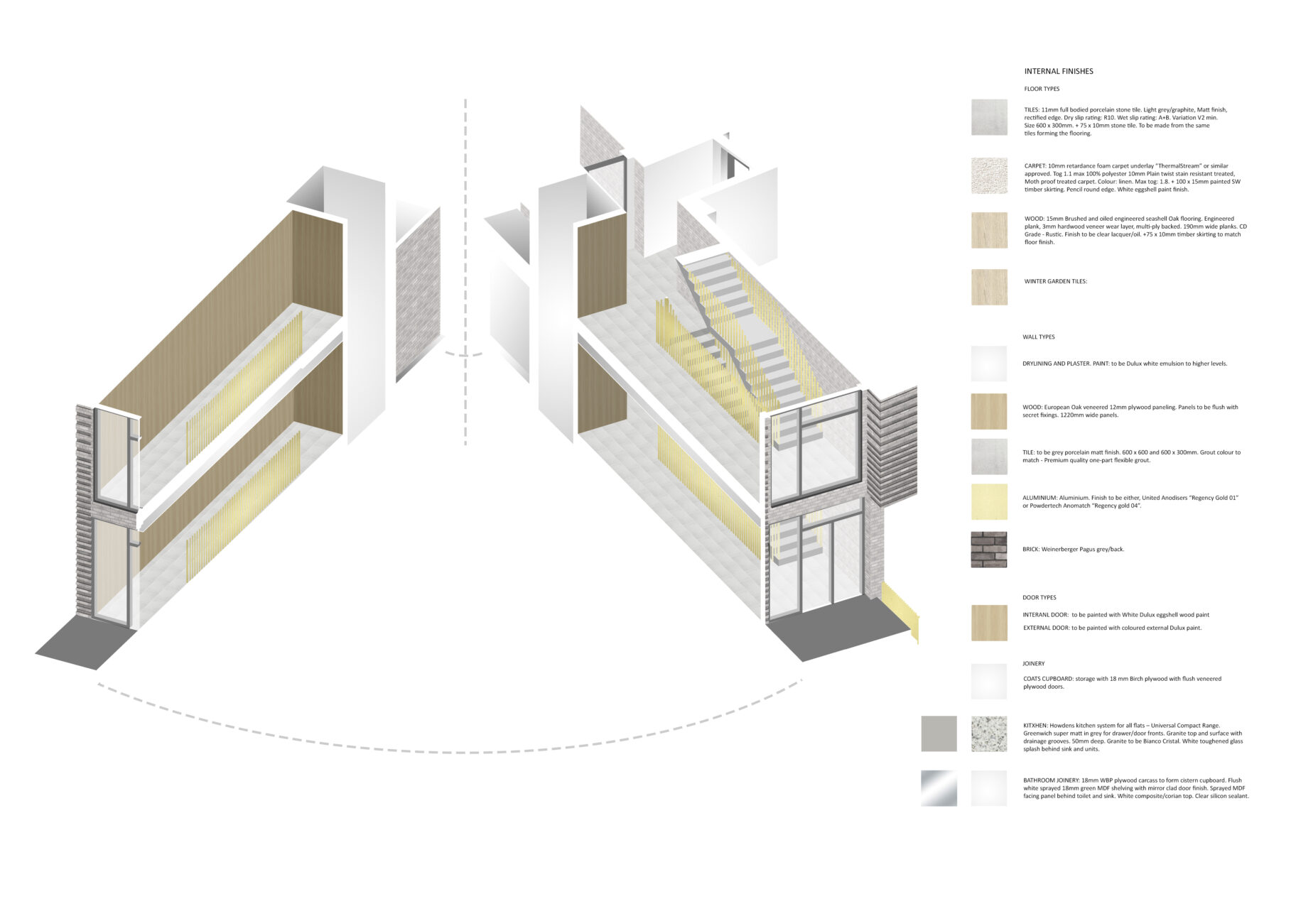The apartments are served by two full height cores which also set back from the road, providing a clear access and entrance way but also a visual break within the building. The cores serve apartments both sides and also the basement. To further enhance the break, the cores have a set back staircase which provides double height spaces to the street side.
