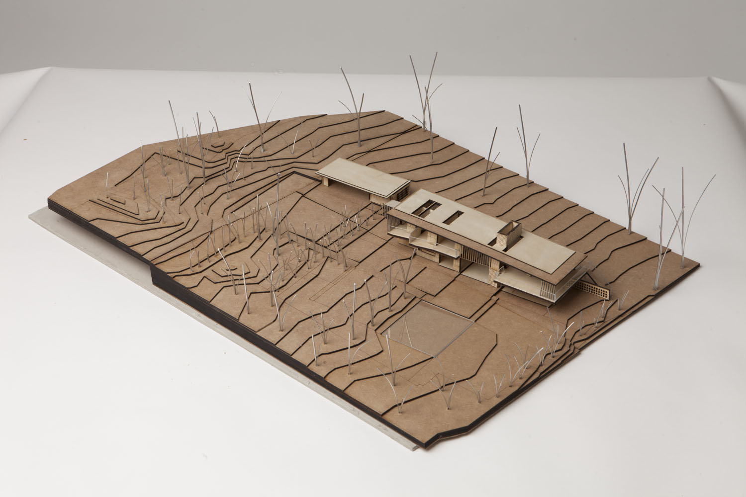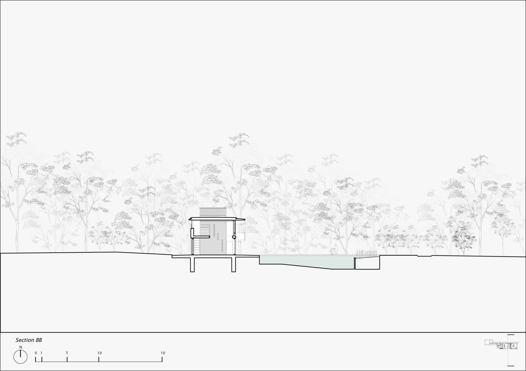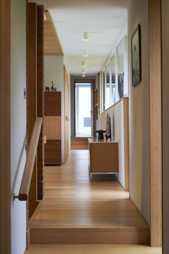 The entrance is expressed via a large metal clad front door. Once through the door, there is an entrance hall with brick flooring and coat cupboard, bench. A W.C and shower is off to the right. At this point the view is directed down the spine wall which terraces down with storage and gallery along the way and a single window seat framing a view of the large trees to the North. The view at the end of the gallery is centred on the fireplace.
