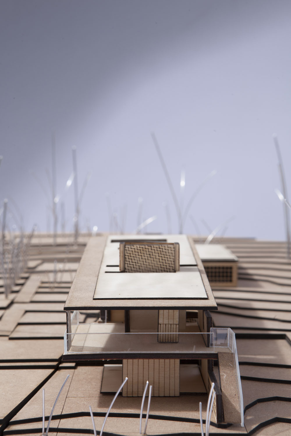 The wall represents the brick walled gardens in traditional English gardens. To manipulate with the wall further we have proposed a varied palette of brick work, from flemish bond, to hit and miss and herringbone bond. The thickness of the wall allows for shadow, and texture along the length as well as high insulation levels.