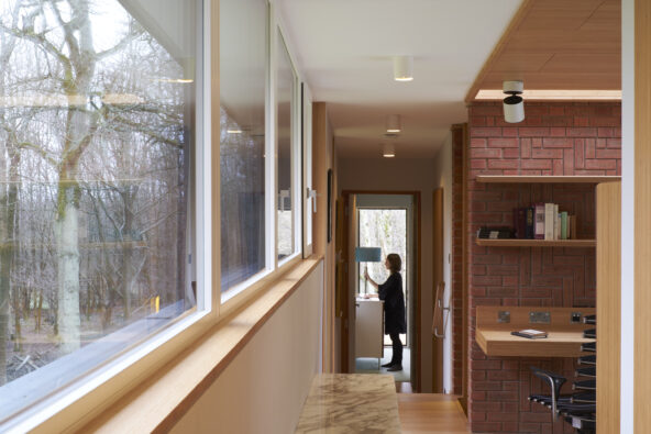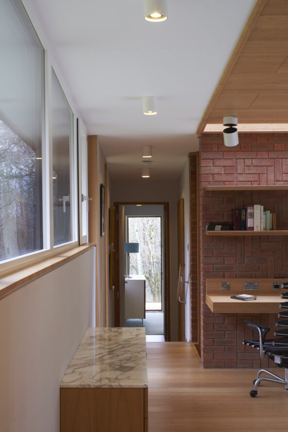 The chimney also houses the staircase to the first floor with a light well above. A change of level through the chimney leads to the living space which has a corner view of the copse and landscaping. A window seat allows views to the North. In addition the living room wall is exposed brick which continues outside to form a low garden wall to the Eastern terrace.