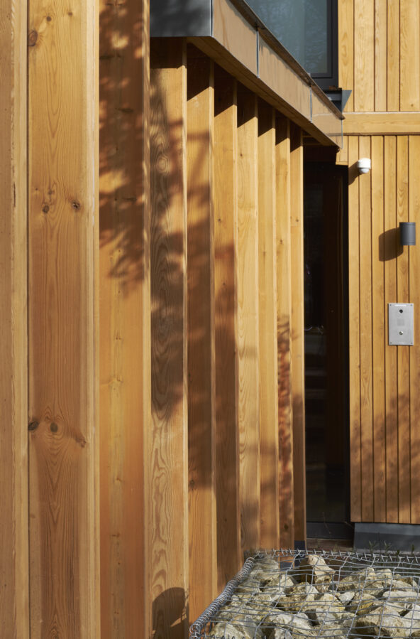 As a foil to this more solid element, the southern facades of the house are more glazed and timber clad. The timber being a mixture of 50 mm sawn timber cladding and planed for doors and vents. A series of timber louvres shade the Western sun and provide privacy for the bedrooms.