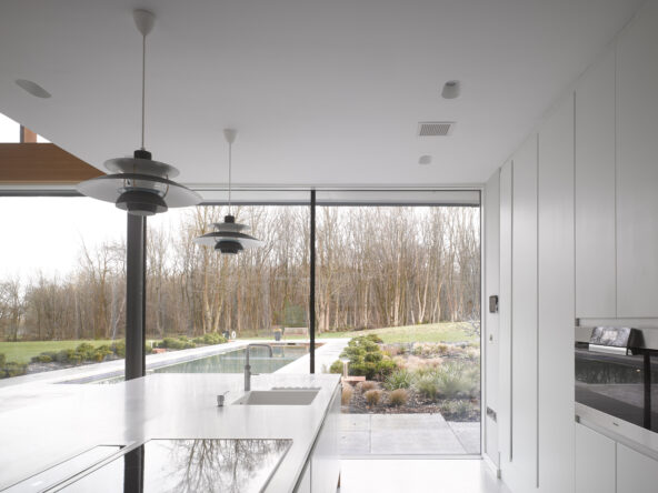 A highly insulated and airtight fabric with triple glazed windows ensures that heat cannot escape but also so that the house does not over heat. MVHR with heat recovery moderates the air quality and temperature.