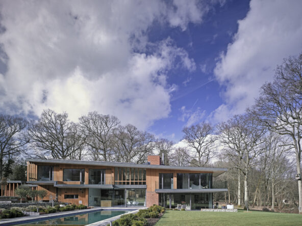 The house also seeks to enhance the surroundings with sedum roofs, new extensive landscaping, wild meadow and woodland management plans for the copse, along with a bespoke bat hotel that we designed in the chimney and owl boxes in the trees.