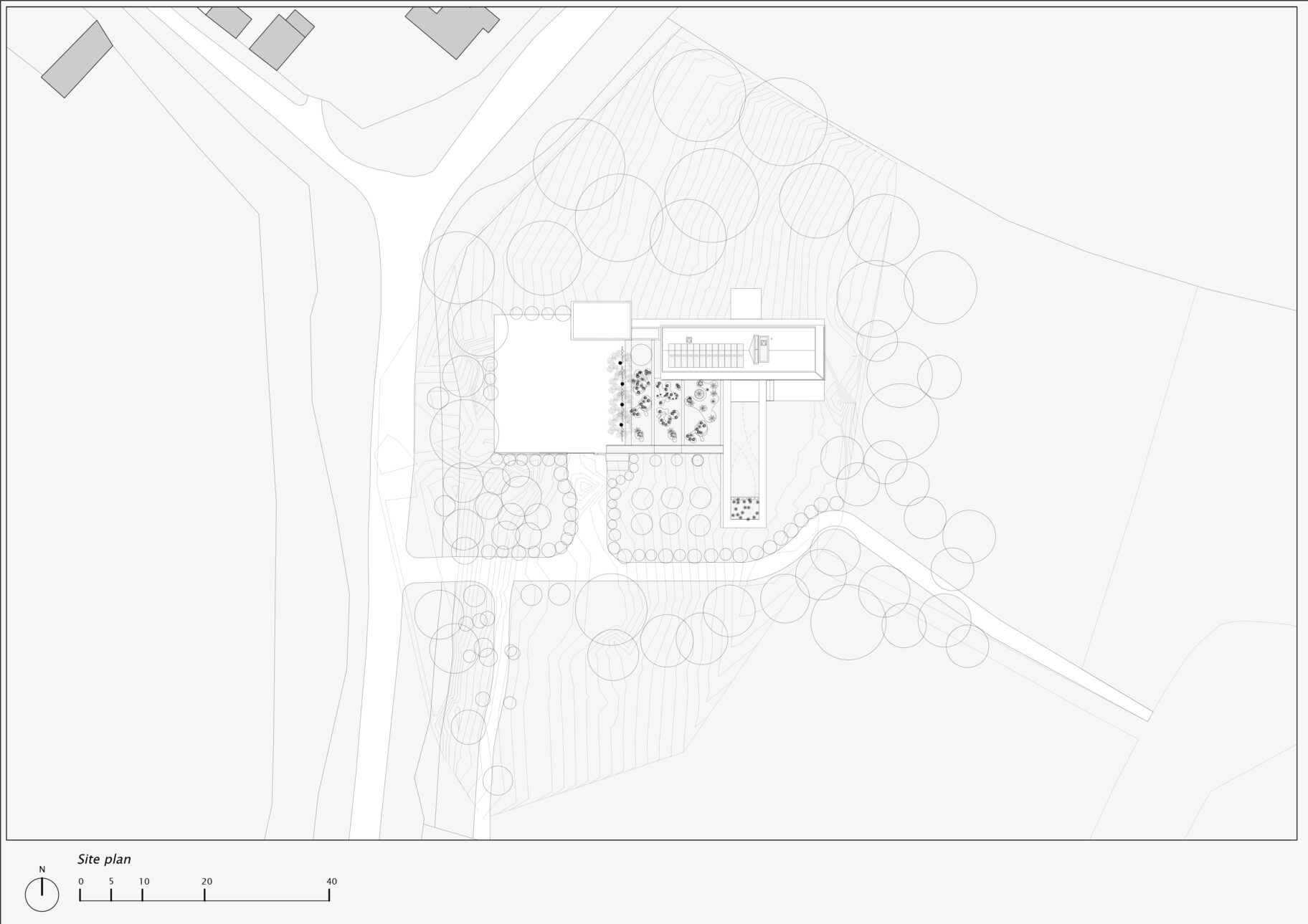 The journey and narrative of the house and site starts at the new entrance with a sloping driveway down to the car port. Hedges and flowers shield the house for privacy and offer a level of surprise once in the house. The car port is open to reduce its mass and also houses a log store and cycle, bin store. Here the red brick spine wall wraps around the functions with the use of hit and miss brick work. The timber roof then floats over to the top continuing to the house as a covered entrance way. Vertical timber screens allow for planting to grow along the entrance path. At this point there is a change in level and a small opening through the brick screen into the Northern garden and meadow.
