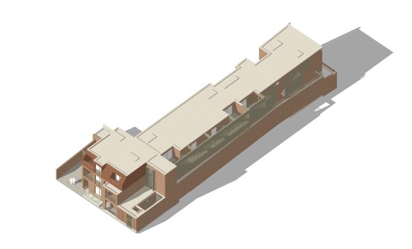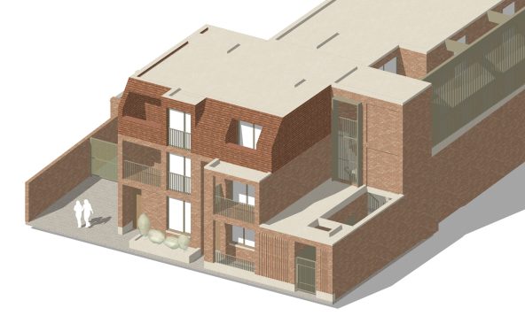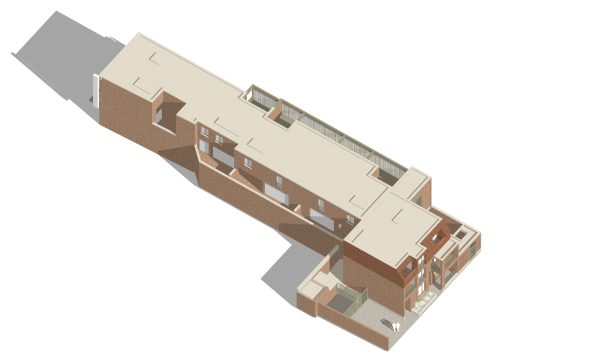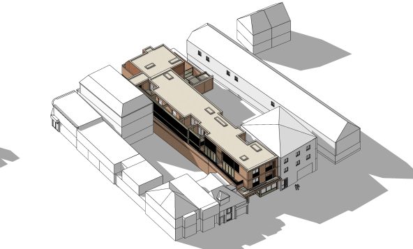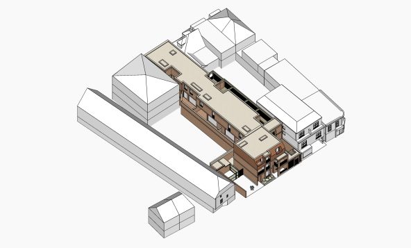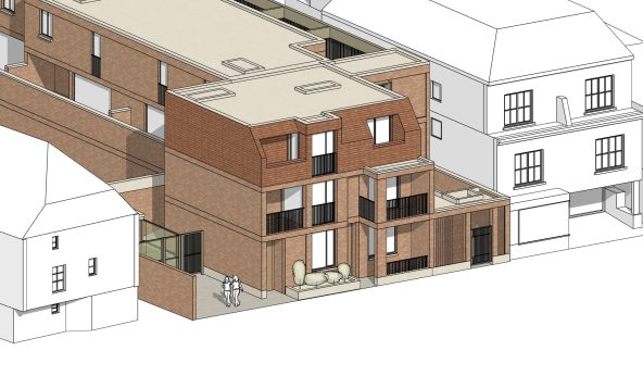 The elevation treatment on the High street picks up the key drivers along the street, and utilises a mix of materials, and a play on the traditional shop frontage along the ground floor. The upper floors are set back and cut away to suit the context, daylight and the pitched roof forms of the adjacent buildings.